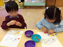 折り紙、製作、粘土、パズル、リズム遊び、体育遊び、ゲーム遊び等のバランスの良いカリキュラムと、ご挨拶やおやつをいただく等、生活習慣の基本を身につけます。